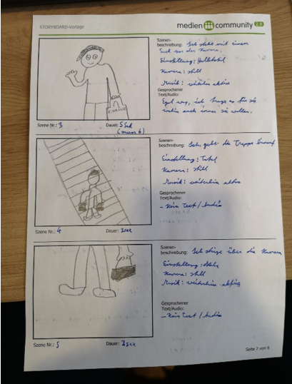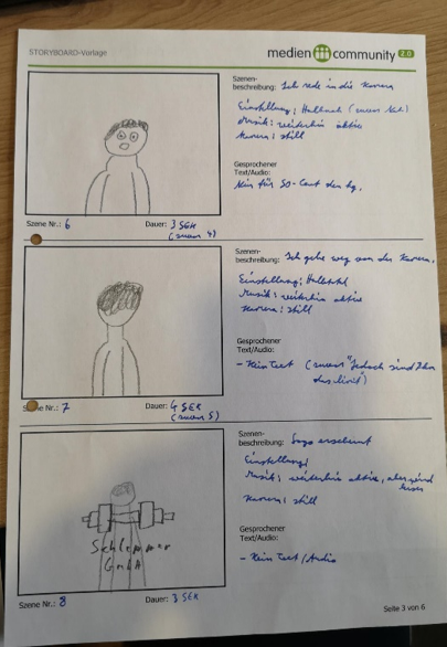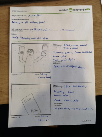 Die Bilder daneben zeigen das zugeloste Storyboard für einen Werbespot der fiktiven Firma Schlepper GmbH sowie unsere schriftliche Reflexion dazu. Bei der praktischen Umsetzung zeigte sich, dass das fremde Konzept einigen Interpretationsspielraum ließ. In der Reflexion haben wir festgehalten, dass vor allem unvollständige Texte und plötzliche inhaltliche Sprünge wie etwa bei einer Szene mit Treppen die filmische Arbeit etwas erschwerten. Als Verbesserungsvorschlag wurde notiert, dass ausformulierte Sätze anstelle von reinen Stichworten die Intention der Autoren viel klarer transportieren würden. Zudem haben wir angemerkt, dass manche Einstellungen für eine bessere Wirkung etwas länger gefilmt werden sollten. Insgesamt wurde das Storyboard als solides Grundgerüst bewertet und mit einer positiven Punktzahl eingestuft, sofern die kleinen inhaltlichen Lücken noch ausgebessert werden.